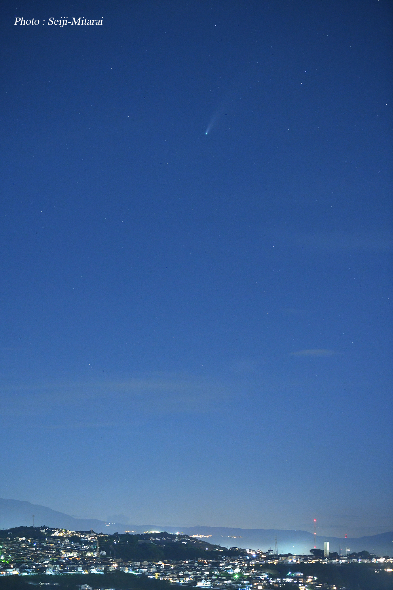 大分市美術館の側の高台から見る西大分の夜景とネオワイズ彗星をご覧ください。