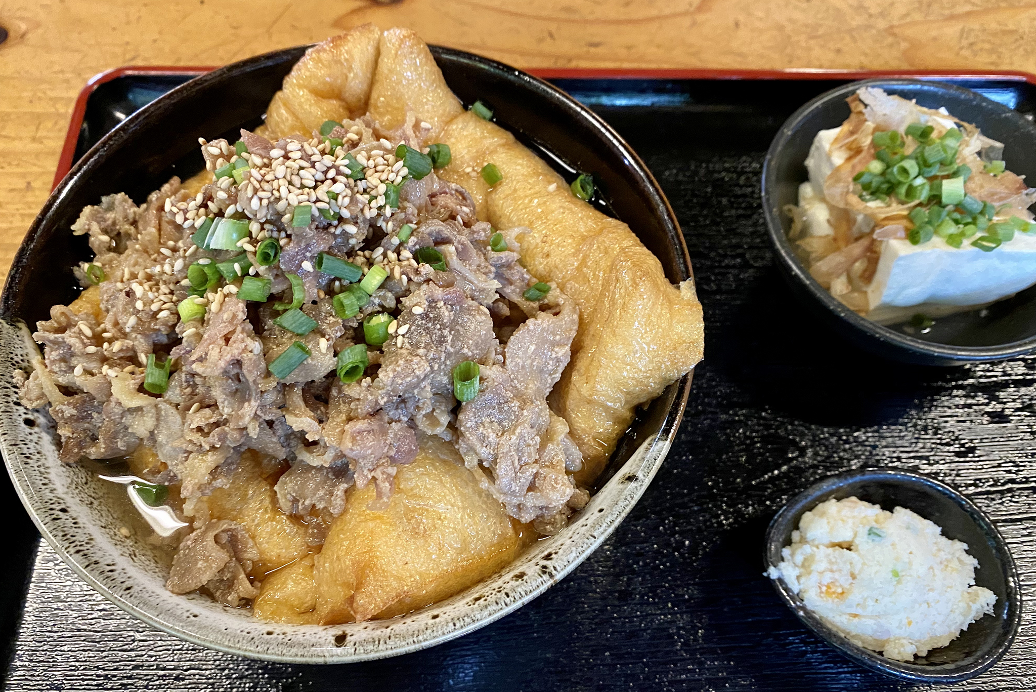 かなり分厚い揚げが2枚入った湧水地鶏うどん定食800円とジャンボいなり2個で420円を注文しました。