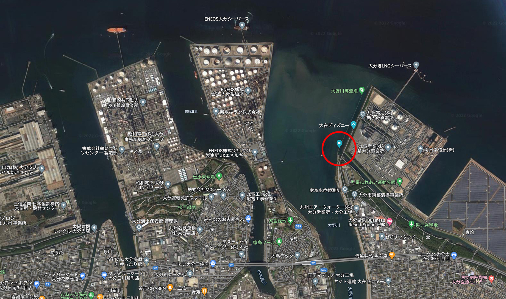 ここは大分県内で唯一の撮影ポイント。九州電力の新大分発電所の前にある堤防から西側を向くと